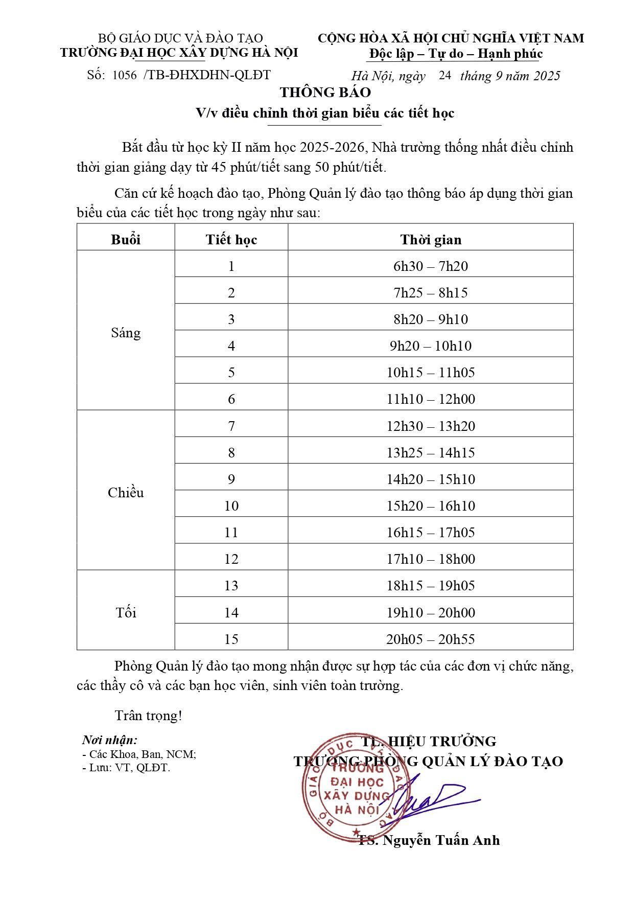ĐIỀU CHỈNH THỜI GIAN BIỂU CÁC TIẾT HỌC TỪ HỌC KỲ II NĂM HỌC 2025-2026