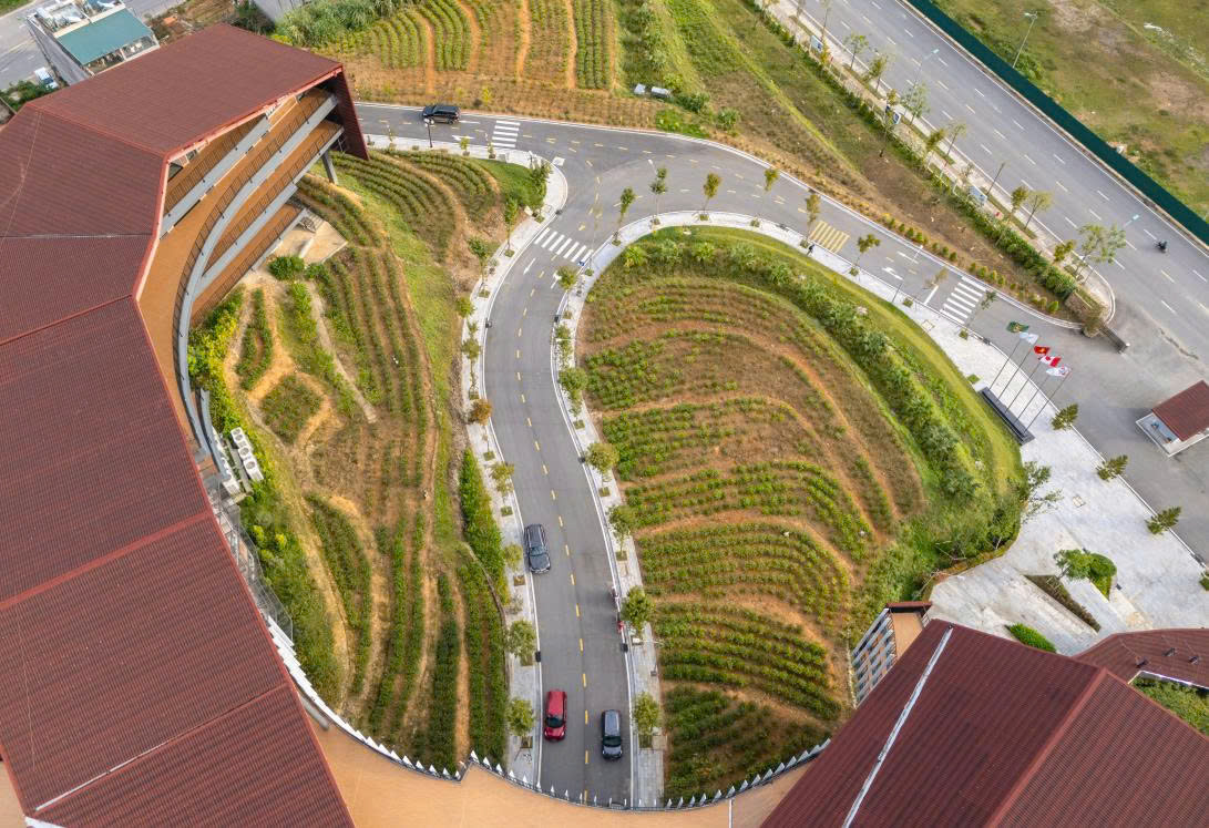 Cảnh quan công trình lấy cảm hứng từ hình ảnh ruộng bậc thang và đồi chè đặc trưng của địa phương