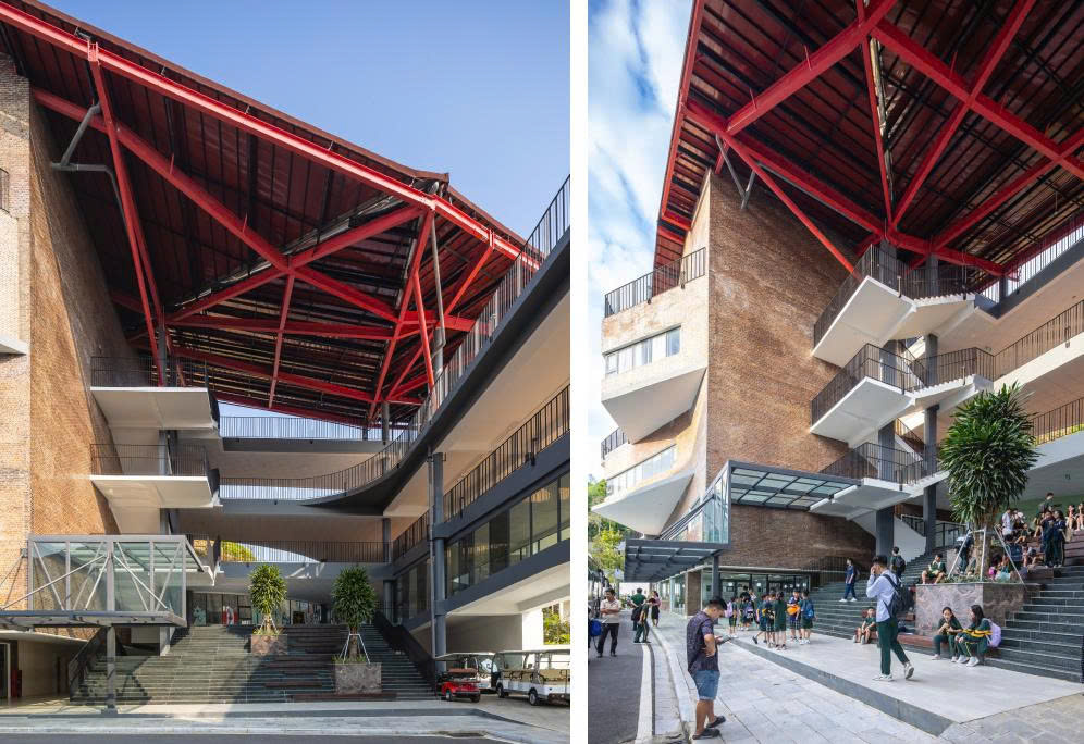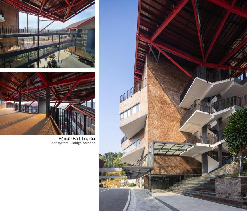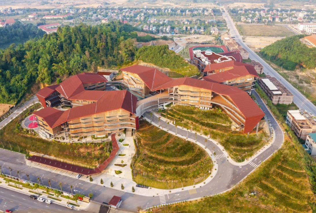 Các khối lớp học được bố trí uốn lượn theo địa hình tự nhiên, tạo mối liên kết chặt chẽ giữa các khu vực chức năng. Hệ thống thư viện, nhà ăn, ký túc xá, nhà thi đấu đa năng đồng bộ, tiện nghi, hiện đại.