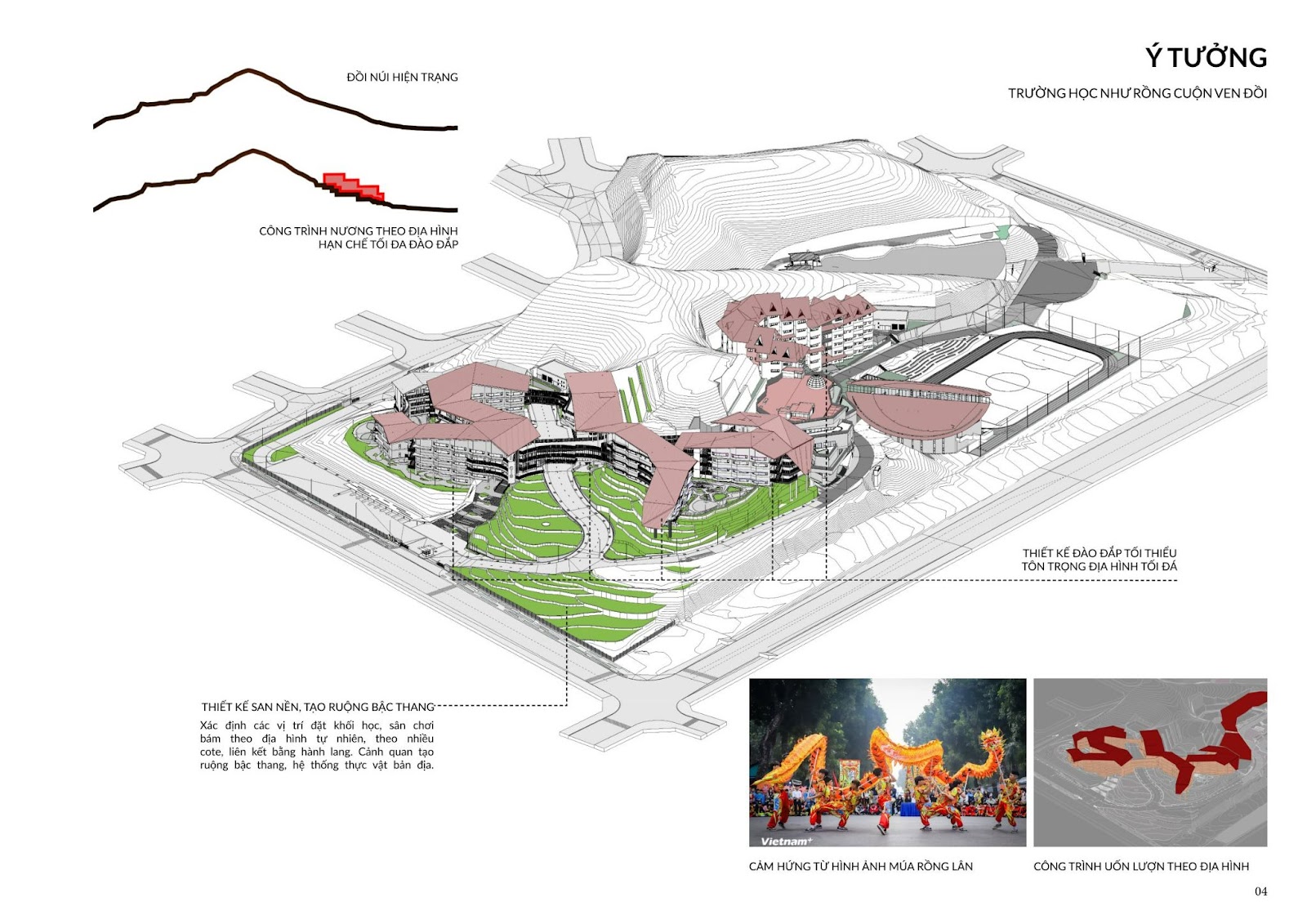Các khối lớp được bố trí uốn lượn với ý tưởng “rồng cuộn ven đồi”