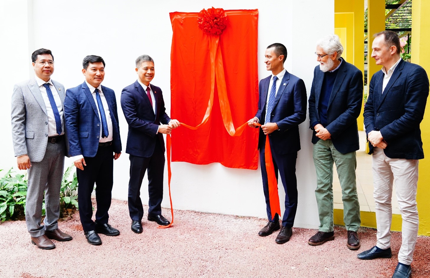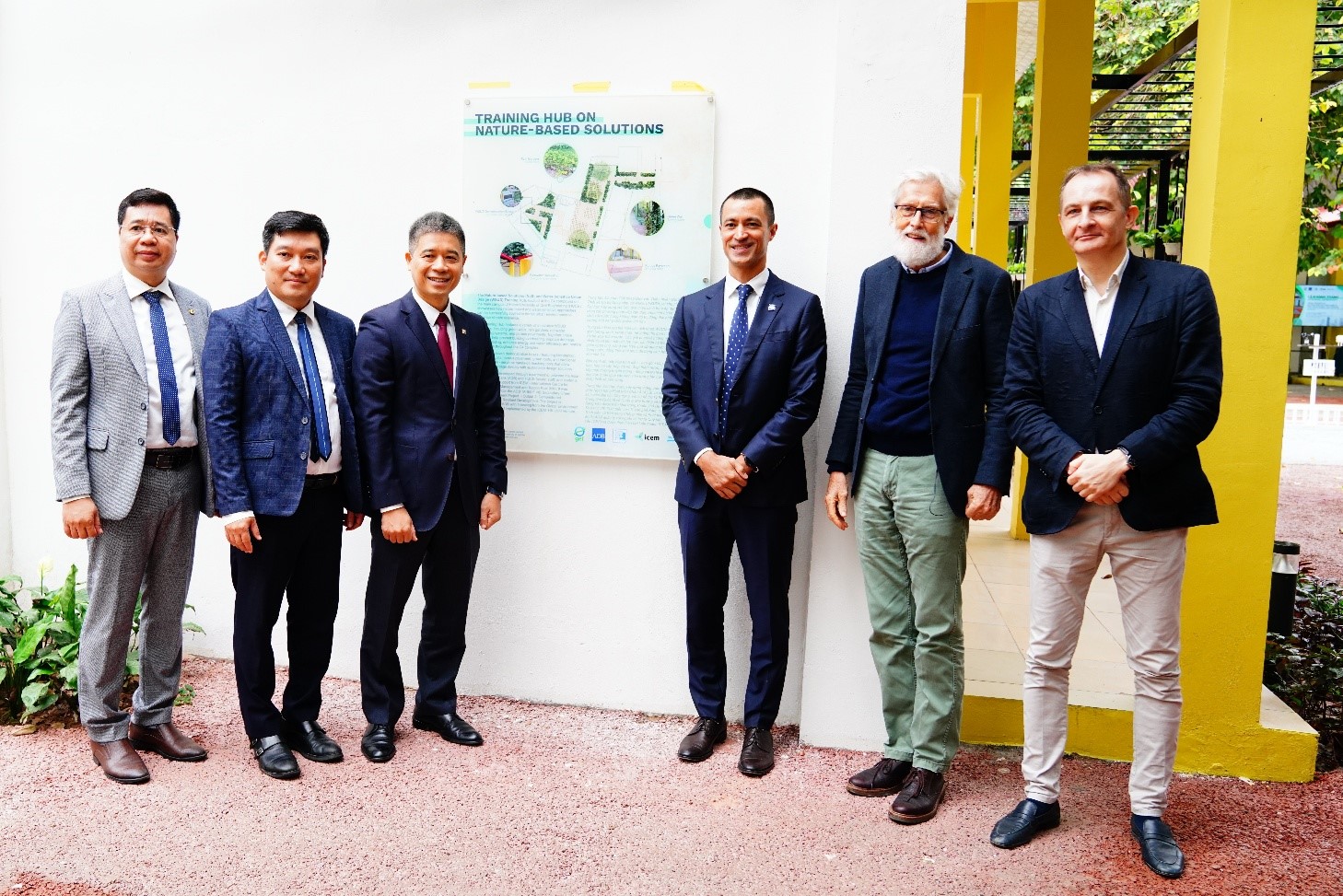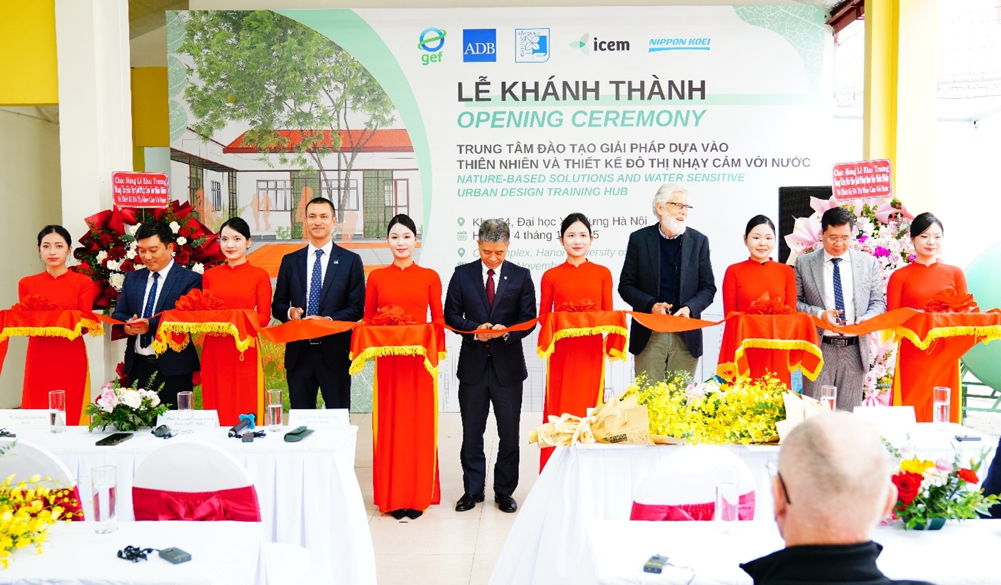 Các đại biểu cắt băng khánh thành Trung tâm Đào tạo Giải pháp Dựa vào Thiên nhiên tại khu vực nhà C4